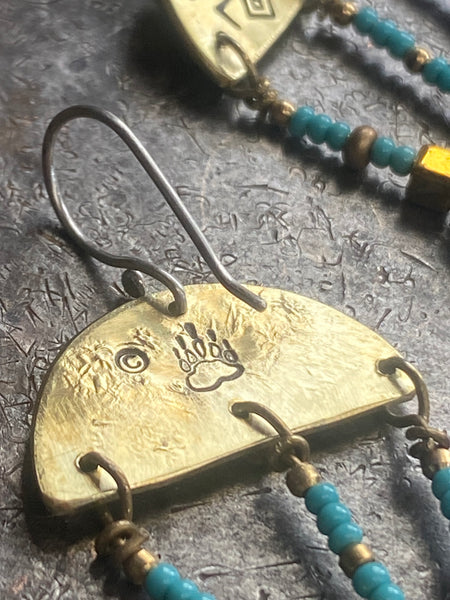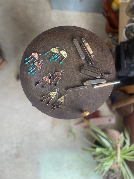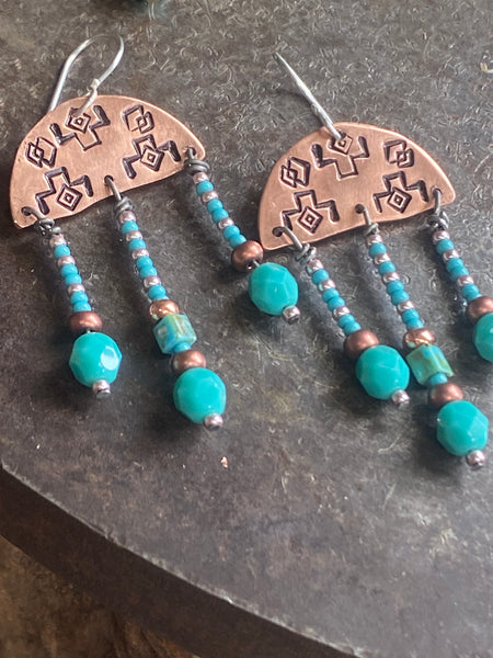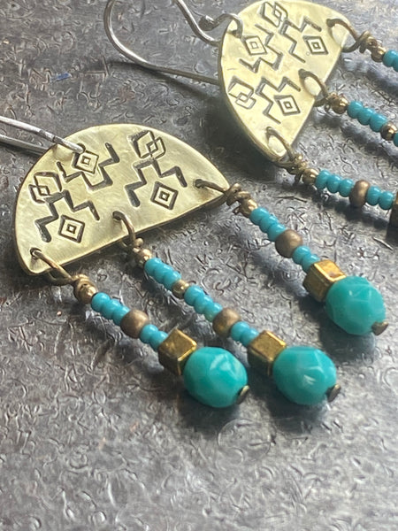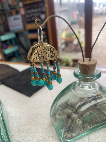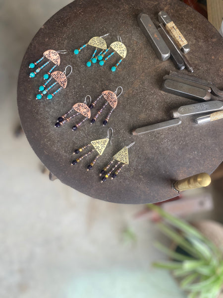 Description: Two different metals to choose from copper or brass with turquoise beads, finished with handcrafted sterling silver ear-wires.